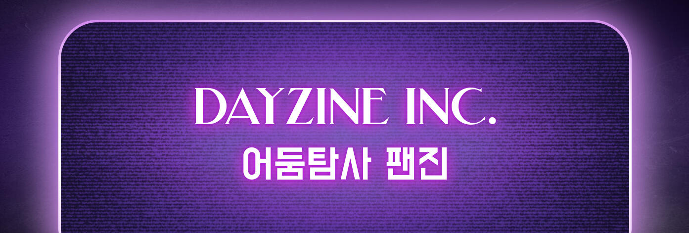 팬진은 기존 작품을 기반으로 한 팬아트와 글을 포함한 비공식적인 팬 작품 모음집입니다. 어둠탐사 팬진은 백덕수님의 카카오페이지 웹소설을 기반합니다.팬진에는 어떠한 콘텐츠가 실릴 예정인가요?